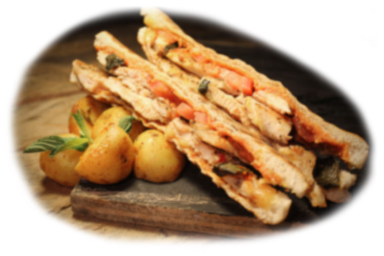 Con pechuga de pollo, salsa suiza y gratinadas con queso gouda.